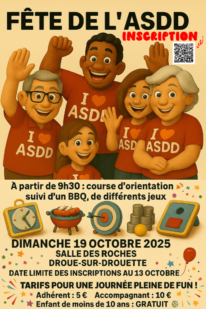 Dimanche 19 octobre 2025, le bureau organise une fête pour tous les adhérents de l'association. Nous vous proposons une course/marche d'orientation suivie d'un BBQ et l'après midi des jeux pour tous.